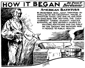 “Do you know that the first bathtub in the United States was made by a rich man in Cincinnati in 1852? It was built of mahogany and lined with tin, and the owner proudly showed it for the first time at a Christmas party. Of course he never used it. Next day the city papers denounced it as ‘wicked, undemocratic and vain.’ Then came the doctors who proclaimed it as ‘unhealthful and a menace to life.’