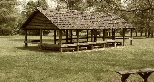 Reduced scale reconstruction of the Cherokee council house (or townhouse) at the Red Clay site, Red Clay State Park in Bradley County, TN. Benches would have circled the building as those pictured, to seat the delegates from the eight districts. The original council house would have been much larger in order to accommodate the nearly 5000 people who would have gathered there.