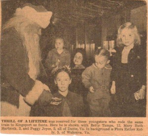 Newspaper source not indicated. The original caption in this undated photo reads: Thrill of a lifetime was reserved for these youngsters who rode the same train to Kingsport as Santa. Here he is shown with Betty Tampa, 12, Mary Ruth Hartsock, 3, and Peggy Joyce, 5, all of Dante, VA. In background is Flora Esther Kelly, 5, of Wakenva, VA.