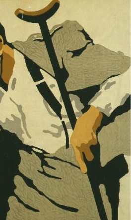 detail of man holding a crutch close to him.