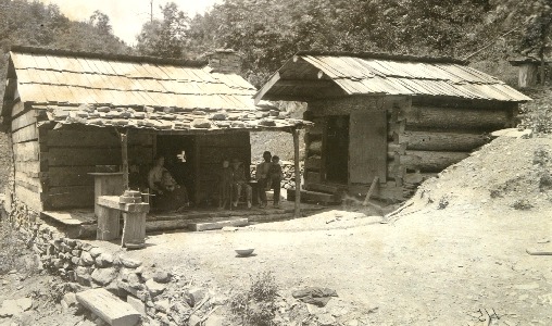 Two log cabins on a hillside with a family sitting on the front porch. A dirt and stone foundation for the cabins is cut into the hill.